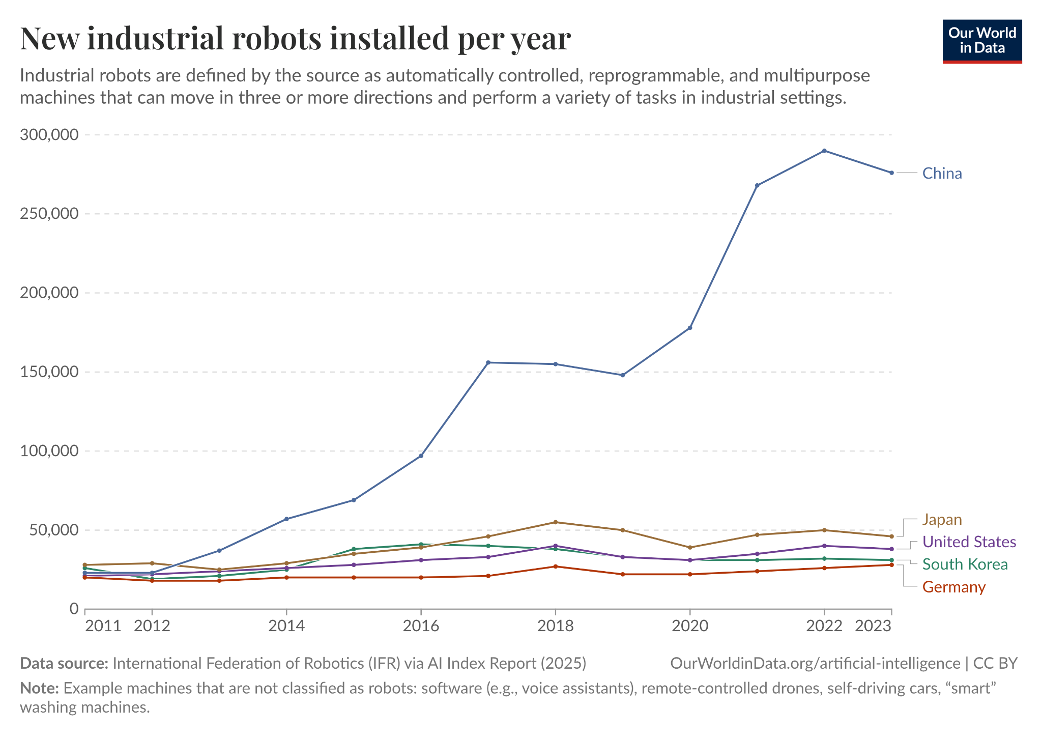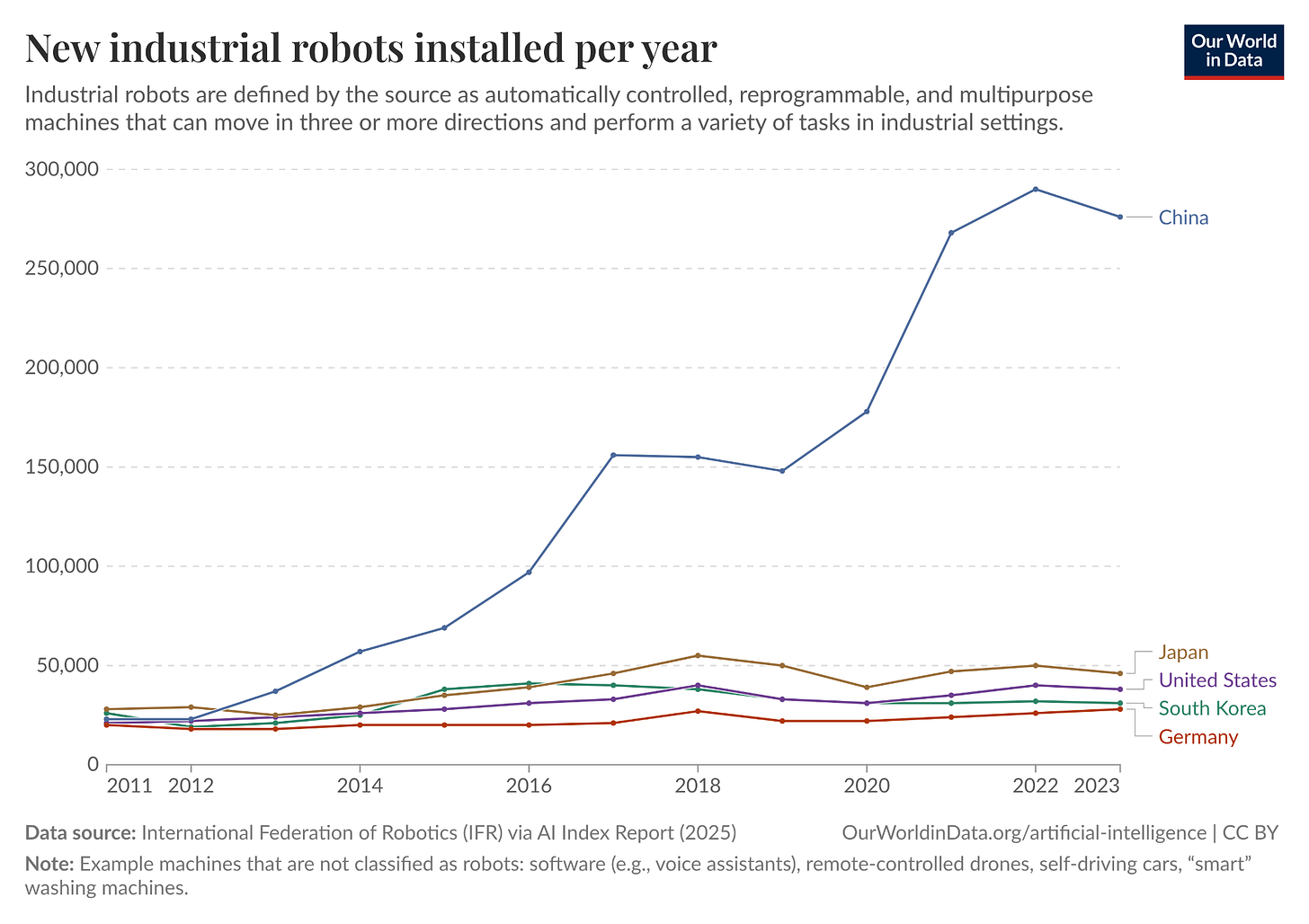 The takeaway here should not be that China is lagging on robotics deployment. The per-capita numbers are probably lower than in the US, but the Chinese manufacturing sector is sufficiently larger than the US that China is still outpacing all countries in absolute number of robots installed annually.
